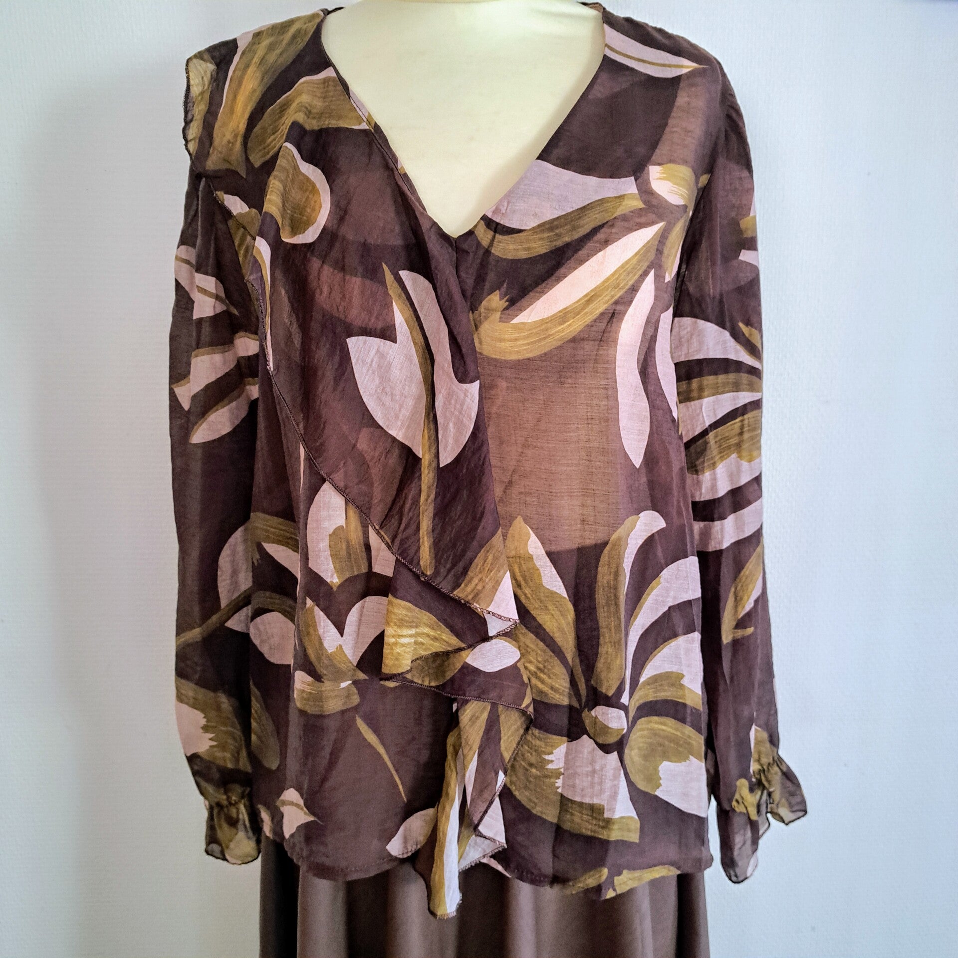 Een prachtige blouse! En zo leuk te combineren voor een avondje uit of lekker met een vest en jeans. De blouse is geheel gesloten, heeft een v hals en een rousel aan één kant. Aan de onderkant mouw is een kleine elastische rousel. De blouse is licht doorschijnend. Verkrijgbaar in de maten S-M en L-XL.